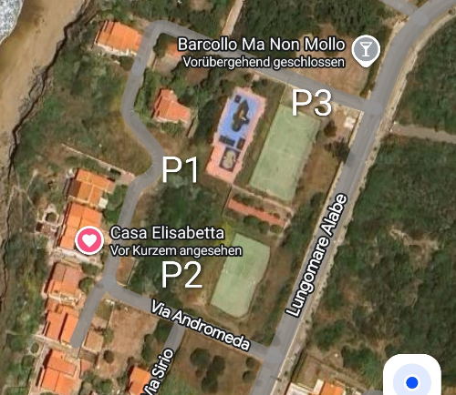 Die "Casa Elisabetta" ist unser wahr gewordener Traum eines Ferienhauses am Meer. Wir treffen uns am Haus für die Zeremonie. Die Adresse lautet Via Pegaso 15, Porto Alabe. Vom Hotel Villa Asfodeli zur Casa Elisabetta nehmt ihr am Besten das Auto (10 Minuten) - schließt euch bitte zusammen, falls jemand ohne Auto kommt. Ihr könnt beim Tennisplatz parken oder oben an der Hauptstraße. Hier eine Karte dazu: P1 bis P3 zeigen Standorte der Parkplätze.